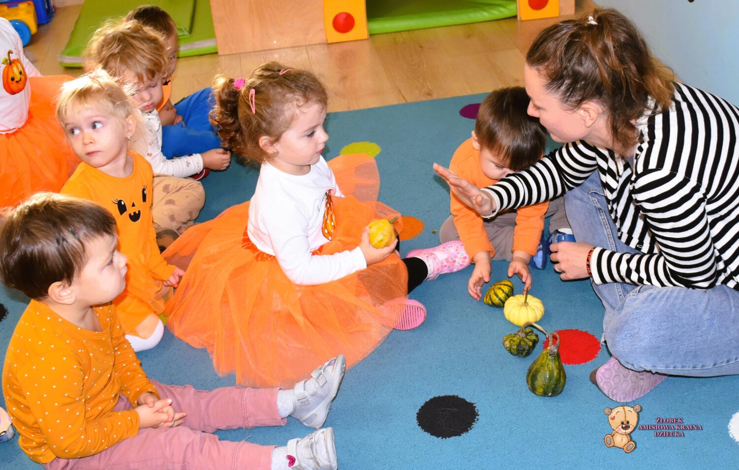 Dziś święto Dyni, dlatego dzisiejsze zajęcia to „Pumpkin festival”. Słuchaliśmy i oglądaliśmy piosenkę o pięciu dyniach ” Five little pumkins” które płakały, ziewały, gniewały się, uśmiechały sie i śmiały. I mając na sali tyle wspaniałych kolorowych dyń utrwalaliśmy liczenie, odliczając nasze dynie.