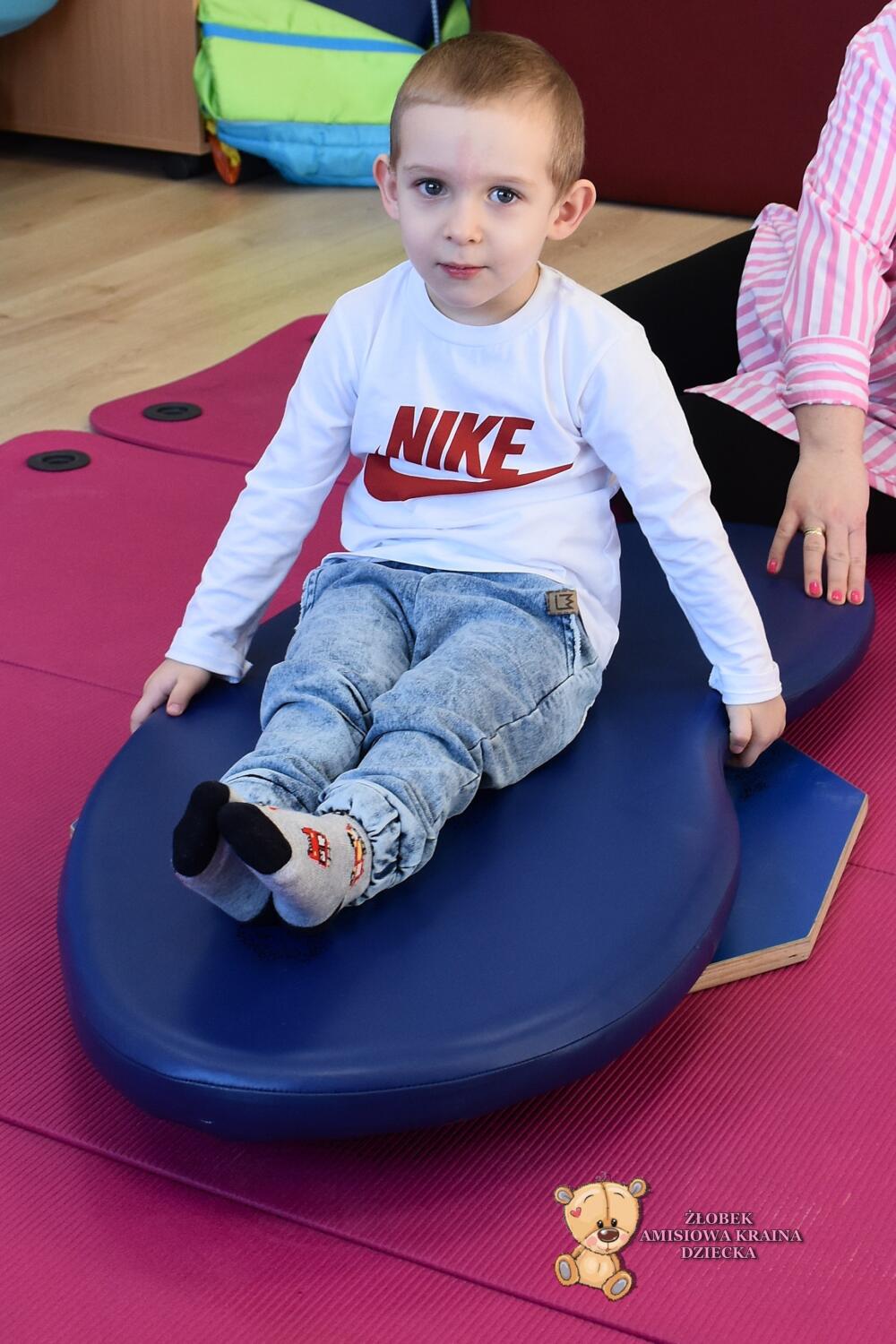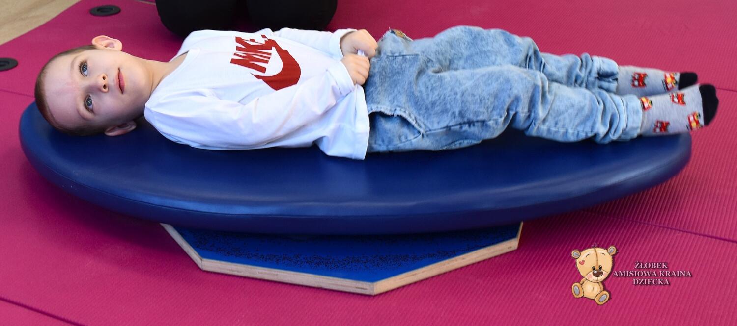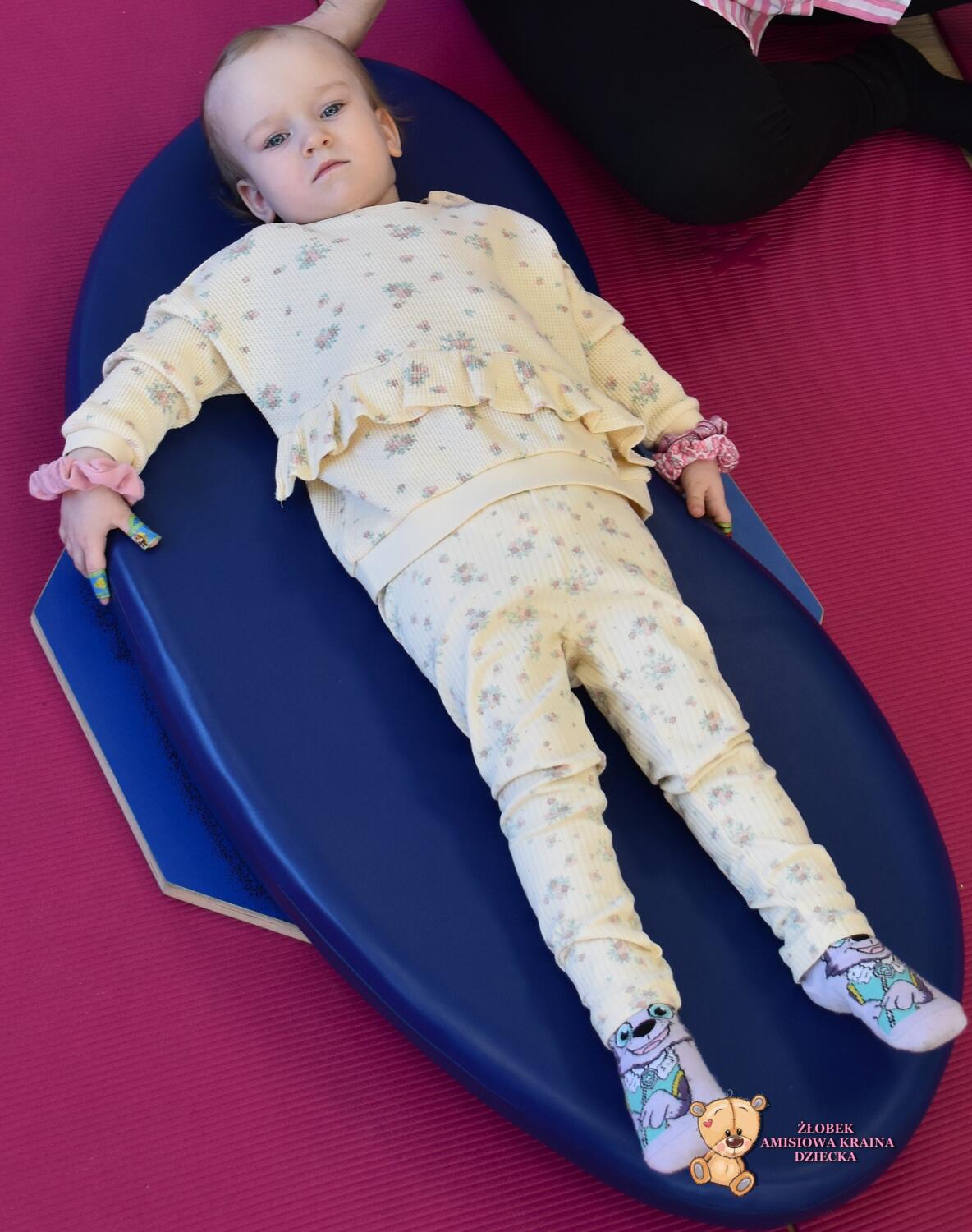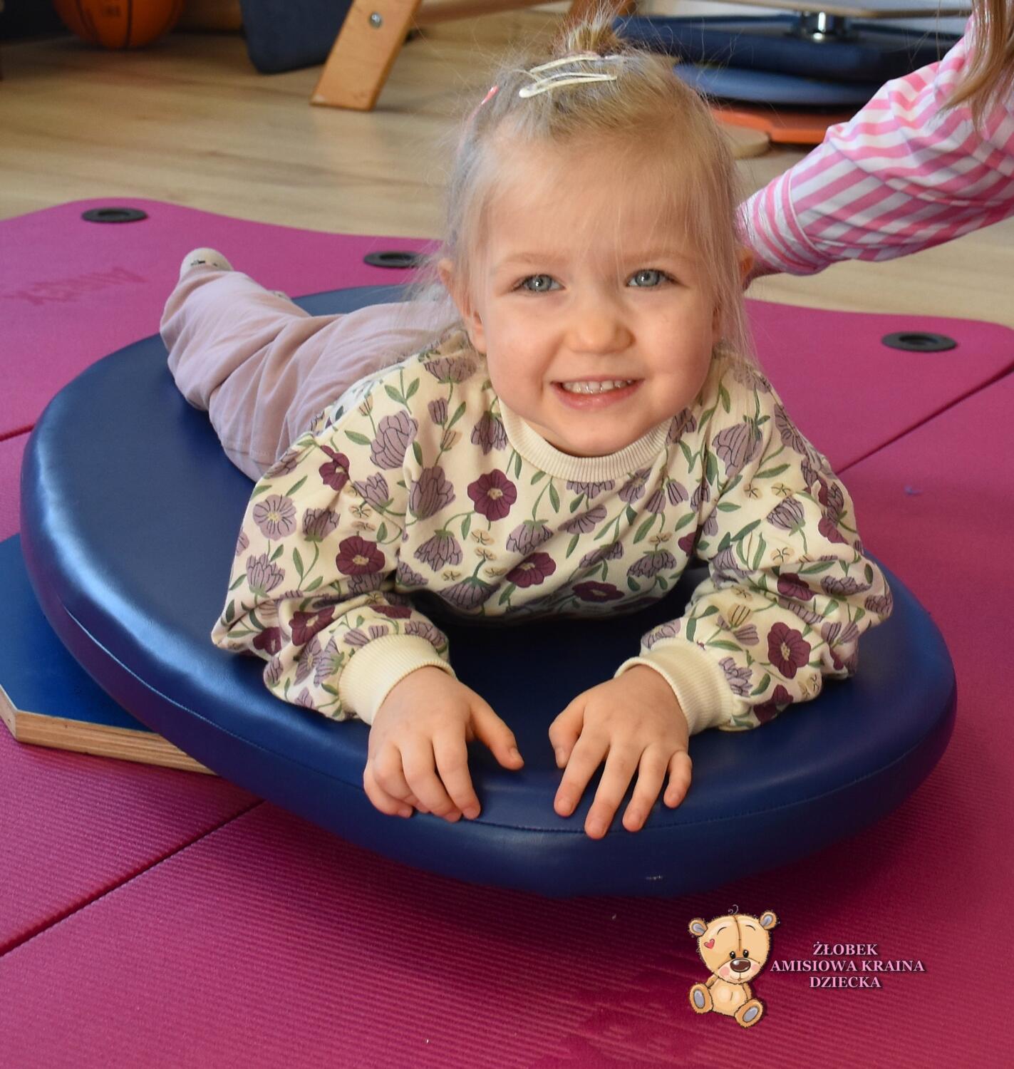 Dziś na zajęciach Integracji Sensorycznej Amisiaki ćwiczyły na desce rotacyjnej. Ciocia wprowadzała nas w ruch obrotowy w siadzie, leżeniu na plecach i brzuchu. Każdy Amisiak miał do wykonania zadanie rozwijające koordynację oko ręką, motorykę małą oraz współpracę obu rąk. Amisiaki spisały się na medal. Wspaniale!