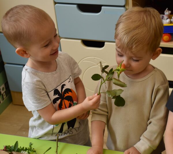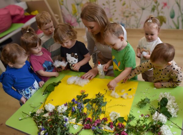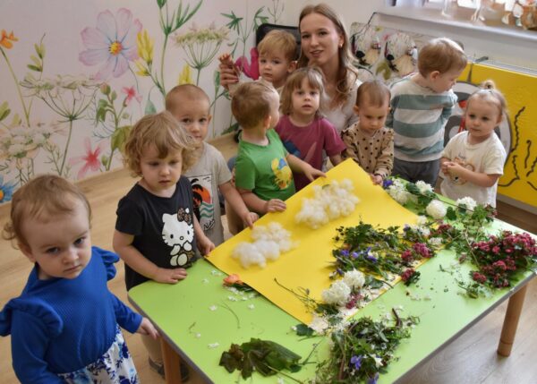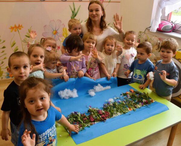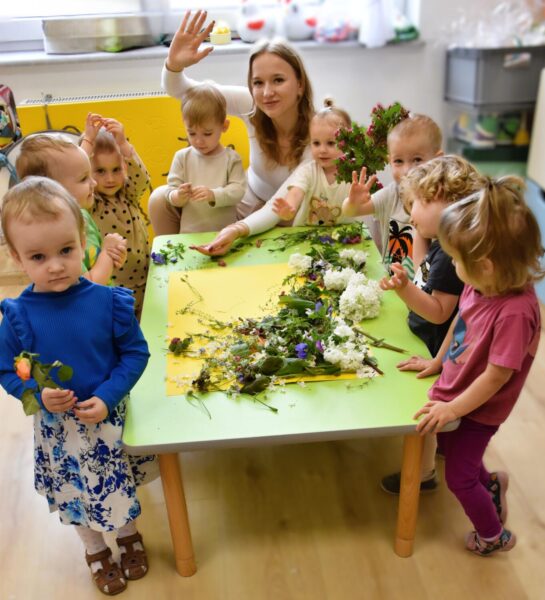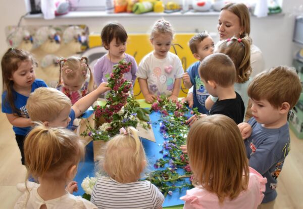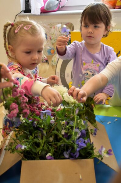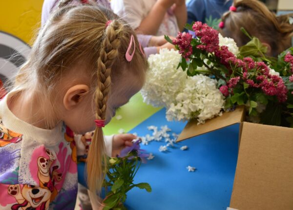 Wykorzystały do tego świeżo zebrane kwiaty, które starannie przyklejały na kolorowy karton, tworząc barwną kompozycję