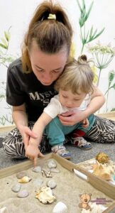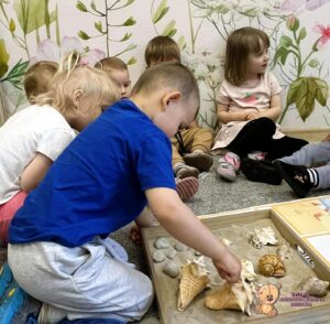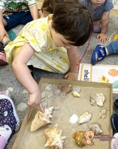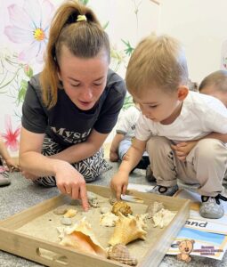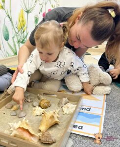 W tym tygodniu na zabawach z językiem angielskim rozmawialiśmy o zbliżającym się letnim czasie. Mówiliśmy gdzie możemy pojechać- nad morze; co zobaczyć- morze, piasek; i co robić- pływać, jeść lody czy budować zamki z piasku. Na koniec liczyliśmy muszelki i kamyczki, które znajdowaliśmy w piasku.