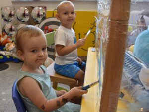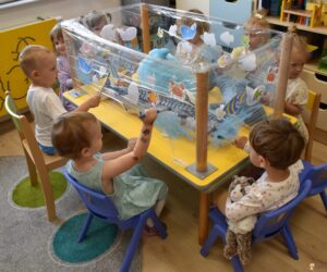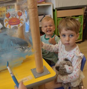 Wczoraj na zajęciach przenieśliśmy się w klimat morski.Poznaluamy różne ryby i zwierzęta morskie.Na koniec wykonaliśmy swoje małe morze ,gdzie na folii malowaliśmy farbami wodę i naklejając różne morskie zwierzęta