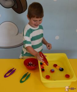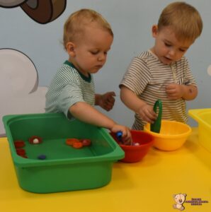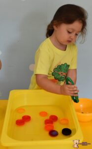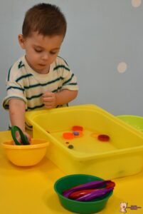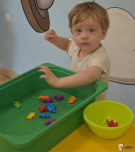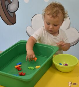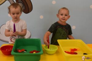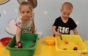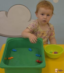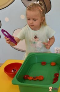 Dziś na zajęciach z metody Montessori Amisie ćwiczyły rączki, koncentrację i orientację przestrzenną Zadaniem dzieci było przenoszenie pomponów za pomocą pęsety. Ponieważ całe zadanie odbywało się w pojemnikach z wodą, zabawa była jeszcze bardziej atrakcyjna