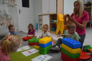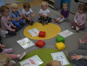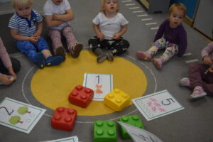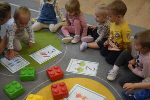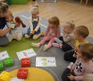 Amisie na zajęciach ćwiczyły liczenie do 5 oraz utrwalały podstawowe kolory. Dzieci głośno powtarzały liczby, dopasowywały przedmioty do odpowiednich kolorów oraz brały udział w prostych zabawach.