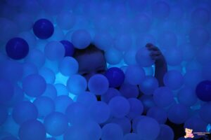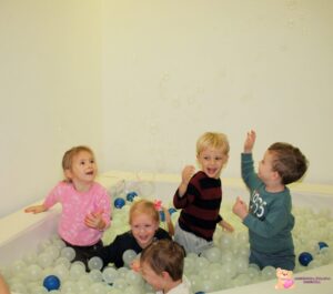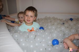 Nie zabrakło też ruchowej aktywności w naszym ulubionym basenie z kulkami 🎉⚽. Zadaniem dzieci było odnalezienie niebieskich kulek 🔵 – kropelek deszczu 🌧️, których chcieliśmy się wspólnie „pozbyć”.