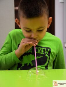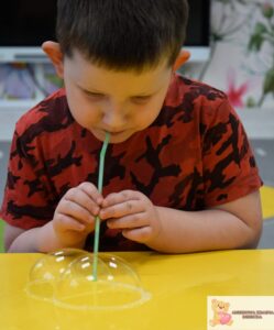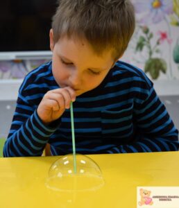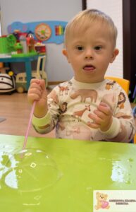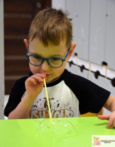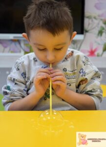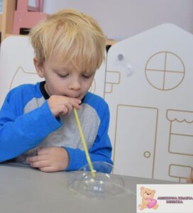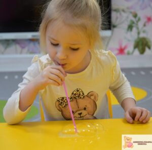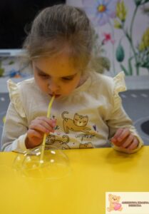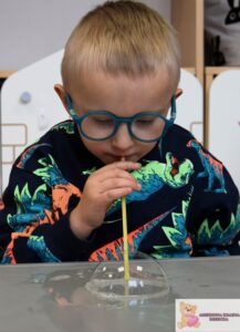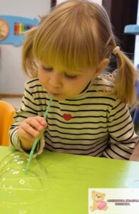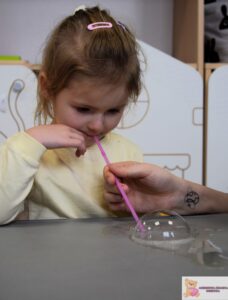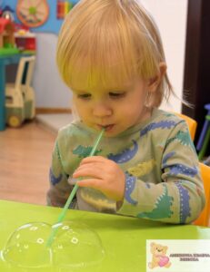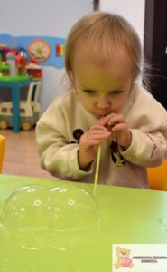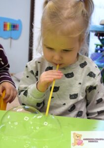 Zajęcia były nie tylko świetną zabawą, ale także wsparciem rozwoju najmłodszych. Dzieci ćwiczyły koordynację wzrokowo-ruchową, sprawność manualną i koncentrację, a także uczyły się cierpliwości i uważnej obserwacji. Eksperymentowanie z bańkami pobudzało zmysły i rozwijało wyobraźnię.