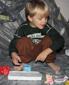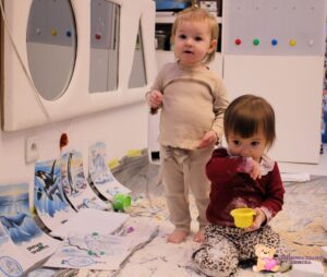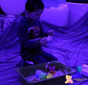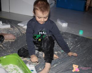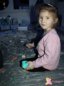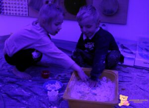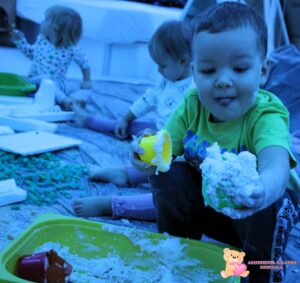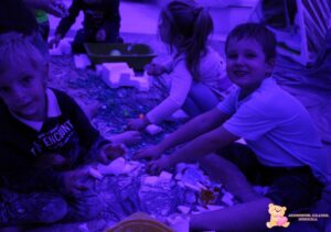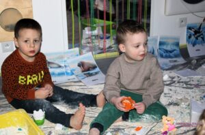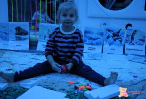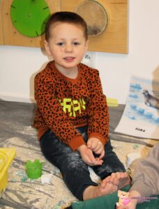 Dziś na zajęciach sensoplastyki przenieśliśmy się na Arktykę. Poznaliśmy zwierzęta, które żyją zarówno na lądzie, jak i w wodzie. Dzieci dowiedziały się, w jakich warunkach mieszkają zwierzęta arktyczne – poznały, jak zimno panuje na nowo poznanym kontynencie. Z dużym zaangażowaniem odszukiwały w mące ukryte zwierzątka, rozwijając zmysły dotyku, wzroku, węchu oraz smaku.