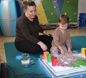 Dziś na zajęciach Integracji Sensorycznej Amisiowe Maluszki ćwiczyły w beczce, przechodziły przez nią jak przez tunel. Beczka lekko bujała się na boki. Trzeba było utrzymać równowagę w pozycji czworaczej. Amisiowe Starszaki dziś stymulowały zmysł dotyku i wzroku oraz rozwijały umiejętności koordynacyjne, utrwalały znajomość kolorów. Ćwiczyliśmy na podświetlanej tablicy z pojemnikiem, w którym była puszysta masa sensoryczna oraz ukryte kolorowe kamienie. Amisiaki szukały skarbów, ukrywały dłonie w masie, ściskały ją, segregowany znalezione kamienie. Wszyscy spisali się na medal, brawo!