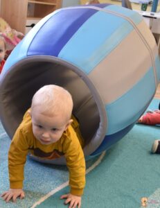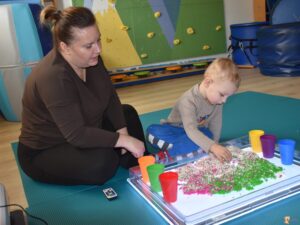 Dziś na zajęciach Integracji Sensorycznej Amisiowe Maluszki ćwiczyły w beczce, przechodziły przez nią jak przez tunel. Beczka lekko bujała się na boki. Trzeba było utrzymać równowagę w pozycji czworaczej. Amisiowe Starszaki dziś stymulowały zmysł dotyku i wzroku oraz rozwijały umiejętności koordynacyjne, utrwalały znajomość kolorów. Ćwiczyliśmy na podświetlanej tablicy z pojemnikiem, w którym była puszysta masa sensoryczna oraz ukryte kolorowe kamienie. Amisiaki szukały skarbów, ukrywały dłonie w masie, ściskały ją, segregowany znalezione kamienie. Wszyscy spisali się na medal, brawo!