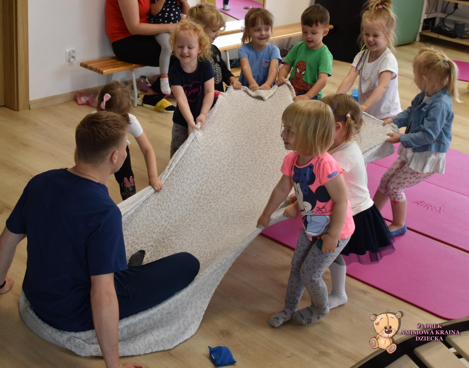 Dziś dalsza część zabawy z kocem dzieci bujały się w nim, a także jeździły ciągnięte przez wujka, a wszystkie straszaki razem ciągnęły też wujka młodsze dzieciaki ćwiczyły natomiast swoje mięśnie wspinając się po zjeżdżalni:)