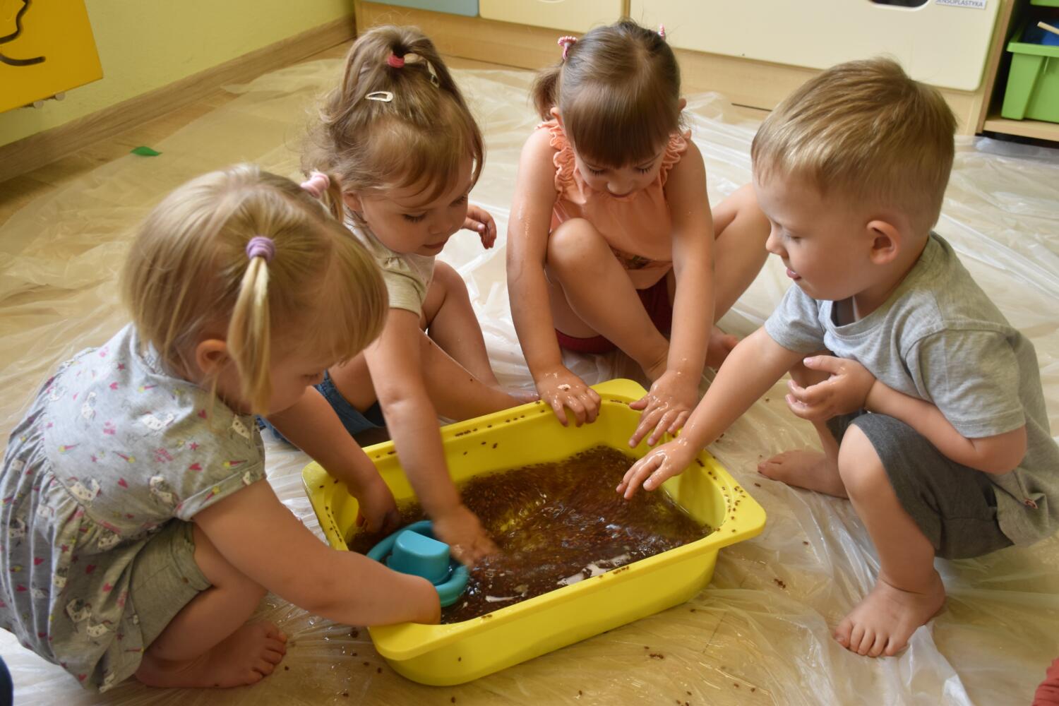Dziś nasze Amisiakina zajęciach z sensoplastyki bawiły się w przyjemnym miłym w dotyku kiślu z siemienia lnianego. Dzieci zanurzały rączki i stopy w masie. Następnie przesypywały ziarenka do misek, co nie było proste bo masa była bardzo śliska. To była super sensoryczna zabawa