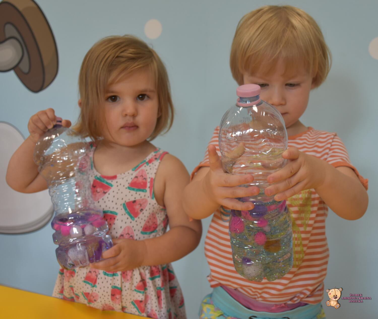 W piątek po południu Amisiaki bawiły się na zajęciach sensoplastyki, wraz z ciocią przygotowały butelki sensoryczne. Dzieci wsypywały do środka brokat, cekiny i pompony. Butelka sensoryczna stymuluje zmysły dziecka: wzrok , słuch i dotyk. Bardzo dobrze wpływa na rozwój małej motoryki , a przy tym przynosi wiele frajdy