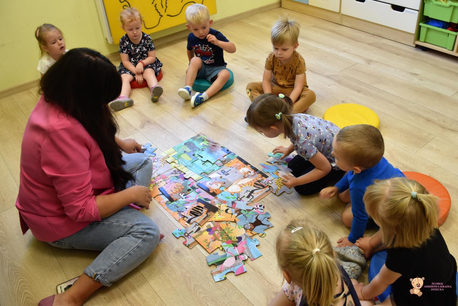 Dziś na logorytmice przywitaliśmy się balonikiem dzieci podawały sobie balonik mówiąc imię kolegi . Następnie poznawaliśmy rożne faktury układając sensoryczne puzzle. Następnie ćwicząc mowę opisowa rozmawialiśmy o powstałym obrazku.