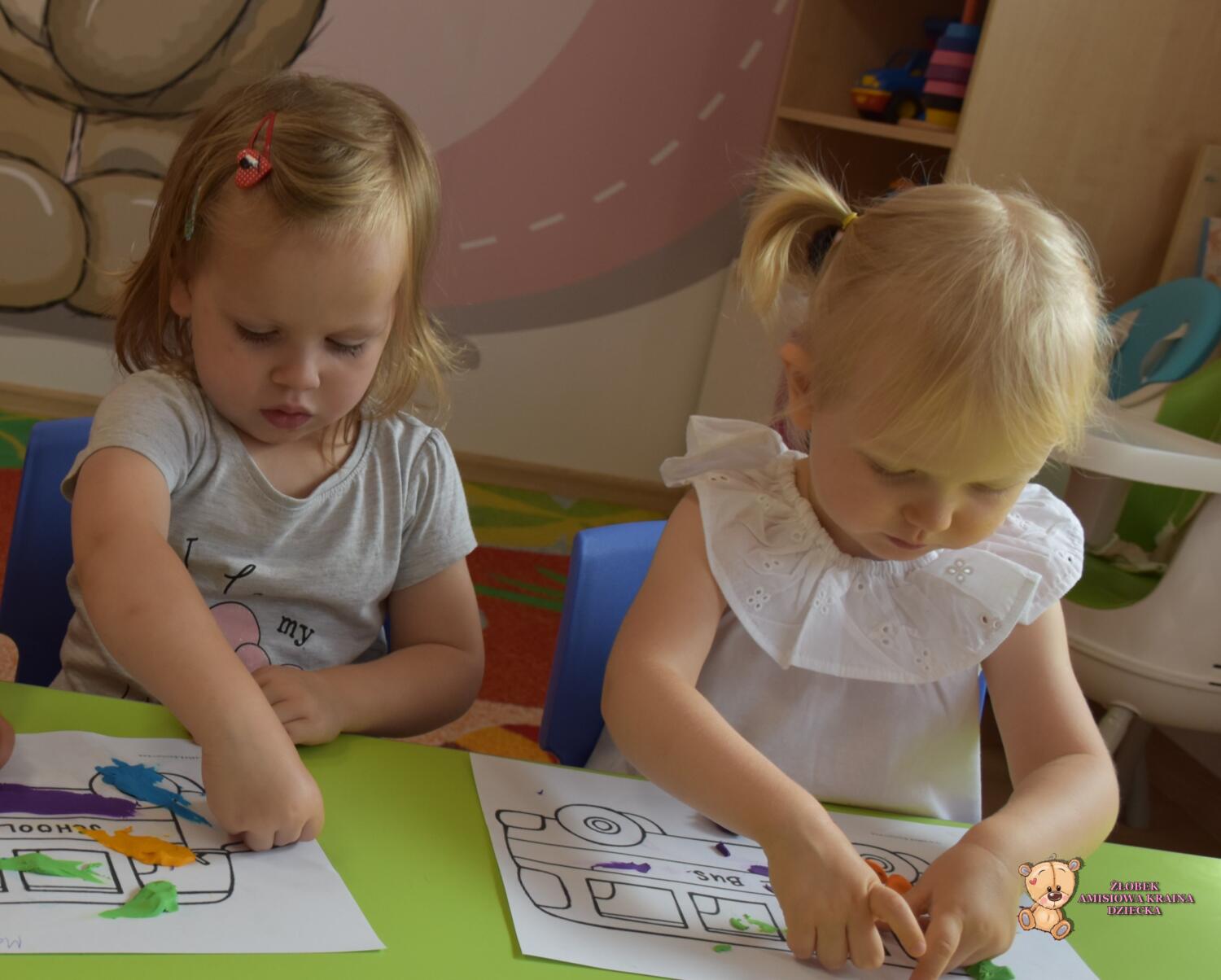 Podczas zajęć plastycznych dzieci wyklejały plasteliną autobus szkolny ćwicząc przy tym motorykę małą wzmacniając mięsnie palców. Wykorzystując kolorową plastelinę, dzieci utrwalały nazwy kolorów.