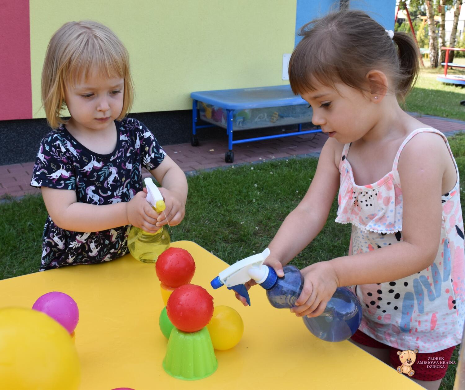 Dziś na zajęciach Montessori zabawy z wodą Amisiaki z wykorzystaniem spryskiwaczy „zbijały” kolorowe piłeczki, które w zaskakującym stylu spadły lub kręciły się Takie zadania wspomagają rozwój motoryki małej, a także wzmacniają palce u dzieciaczków. Było to świetna zabawa, a i udało nam się troszkę ochłodzić w ten upalny dzień