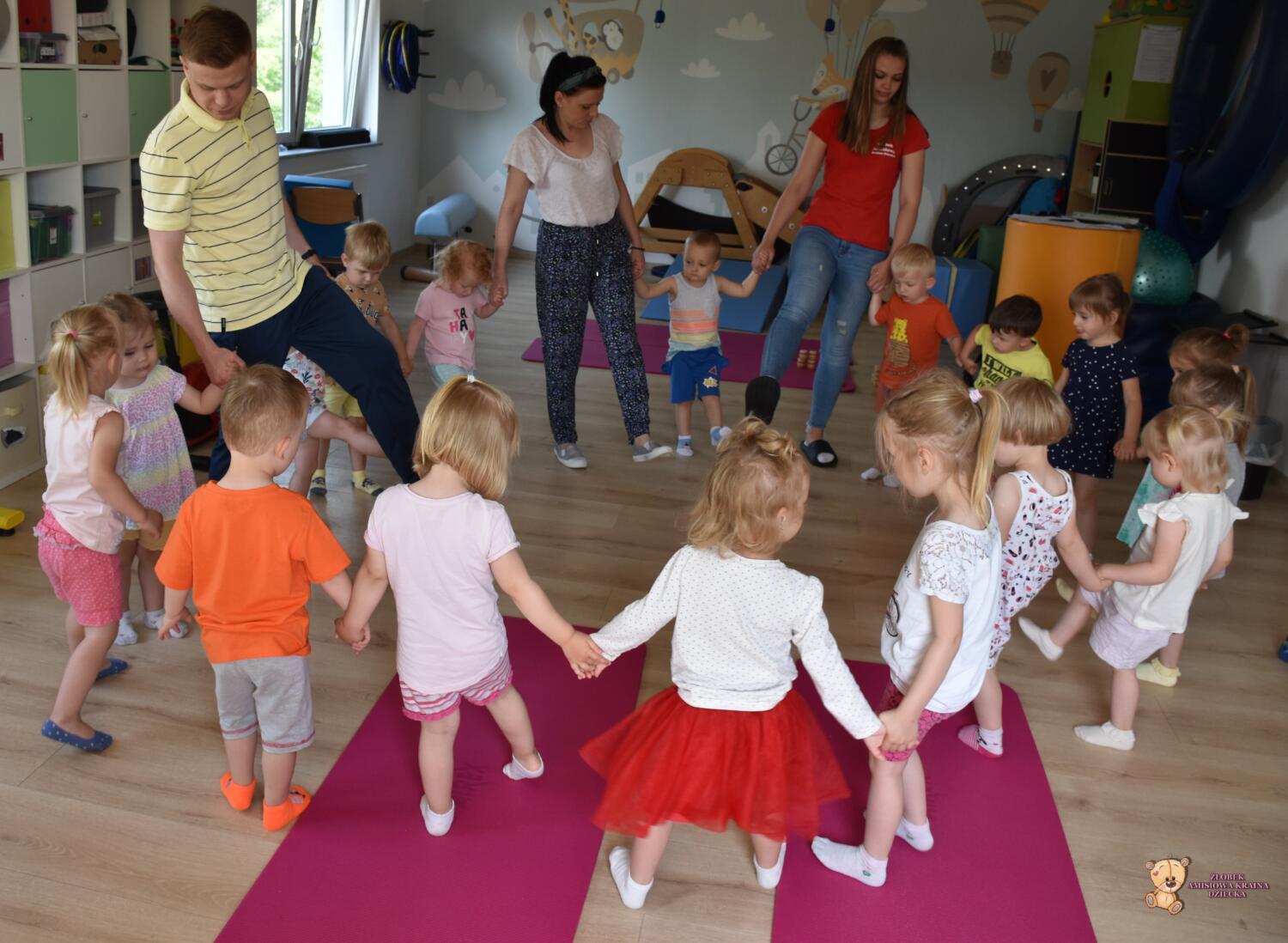 Dziś ciocia Marta ćwiczyła z nami program aktywności Knill . Zajęcia uzupełniają podstawowe zajęcia z neurologopedą, pomagają dzieciom nabywać: poczucie bezpieczeństwa, świadomość własnego ciała, wrażliwość na wzajemnie wysyłane sygnały, nawiązywanie kontaktu i komunikowanie się, podejmowanie aktywności. Sesji zawsze towarzyszy specjalnie skomponowana muzyka, która rozwija się zawsze w taki sam sposób: Muzyka wprowadzająca – spokojna i […]