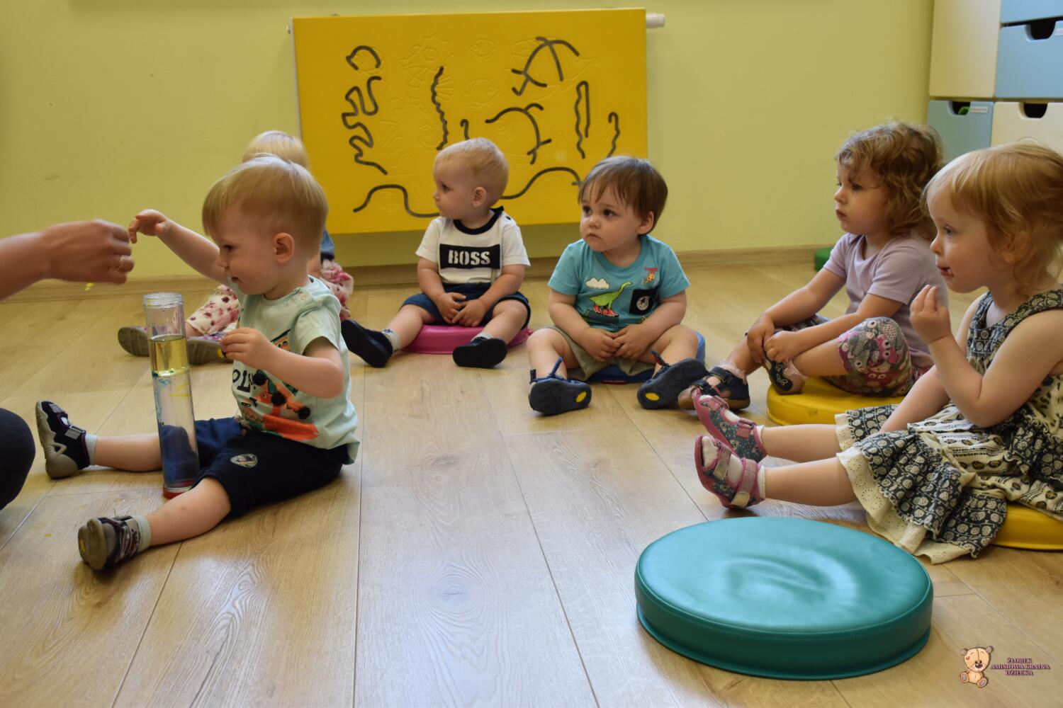 Dziś Starszaki ćwiczyły równowagę i koordynację we wspólnej zabawie w kole, a później przenosiły piłeczkę na łyżeczce. Na koniec dzieci zgadywały po słuchu co jest ukryte w drewnianych słoiczkach i dopasowywały w pary słoiki o tej samej zawartości. Młodsze dzieci dziś bawiły się w piasku kinetycznym, wyszukując ukrytych piłeczek najpierw łyżeczką, a później bezpośrednio rączka.