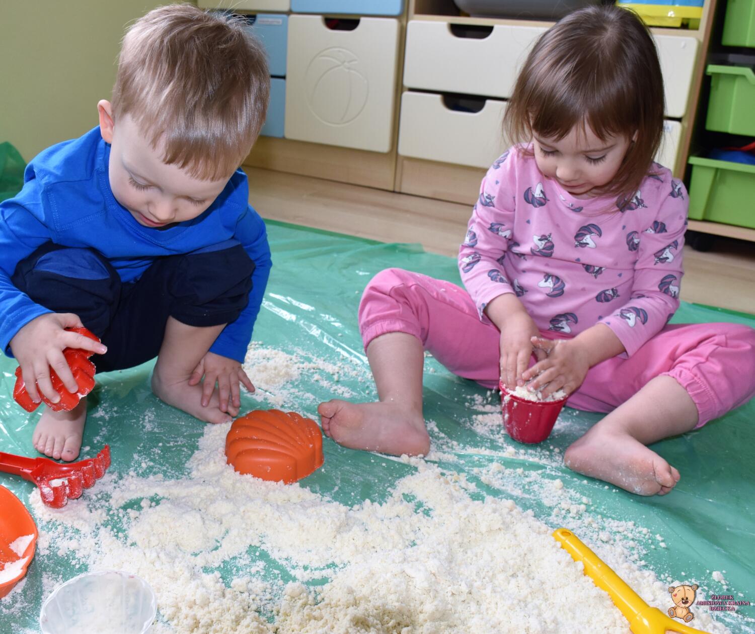 Dziś pogoda za oknem nie rozpieszcza, nasze Amisiaki tęsknią za latem i zabawą na placu zabaw, dlatego dziś na zajęciach sensoplastyki razem z ciocia Klaudia, użyły mąki i oleju tworząc sztuczny piasek a następnie wielką piaskownice ! To była super zabawa.