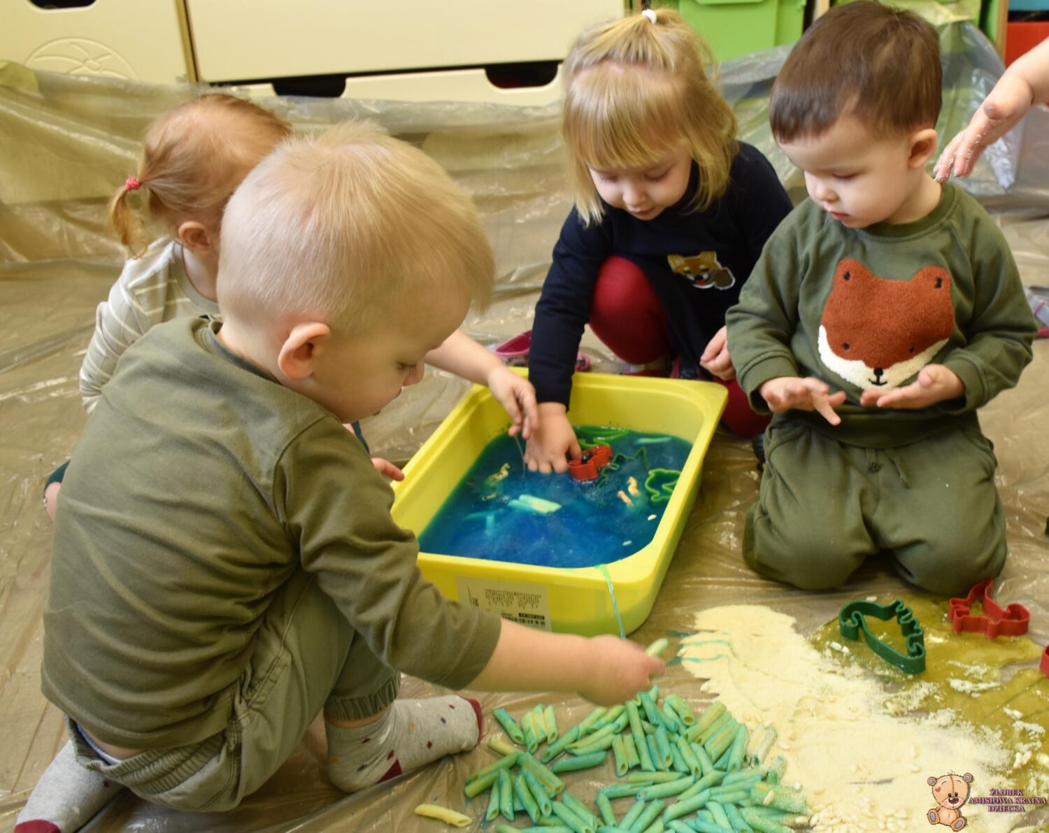 Dziś obchodzimy dzień Dinozaura, odwiedził nas magiczny stworek, który pokazał nam jak z malutkiego jajka pod wpływem wody wyrasta malutki dinozaur, odbijaliśmy figurki dinozaurów w galaretce a także szukaliśmy ich w gęstej masie. To była super zabawa