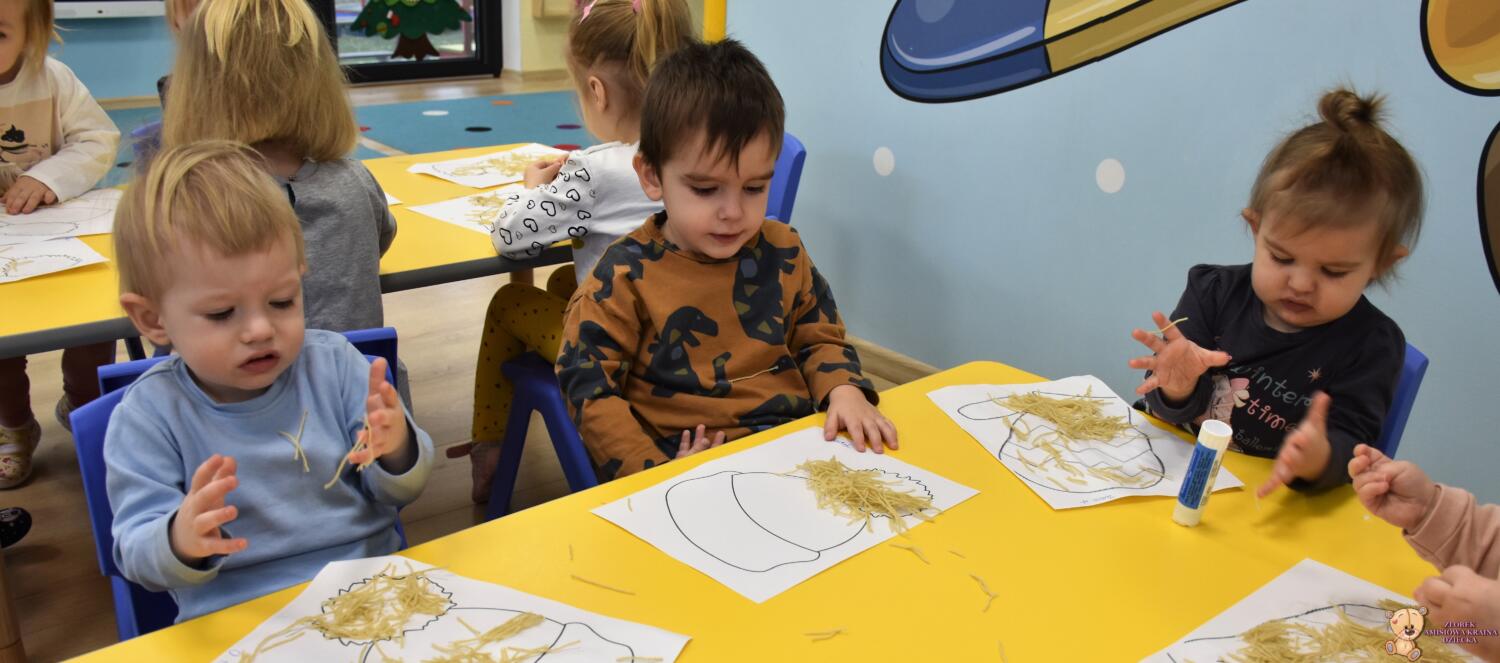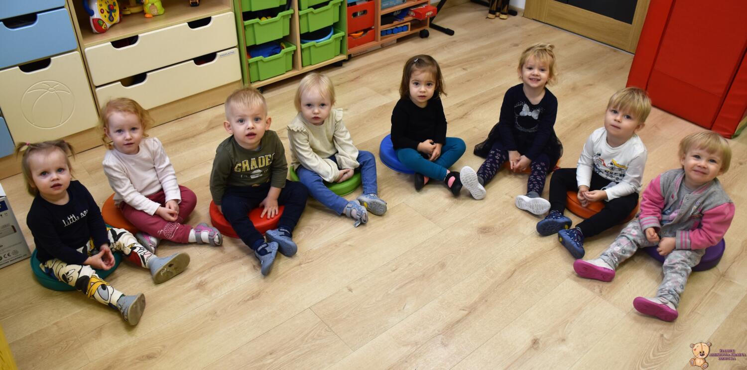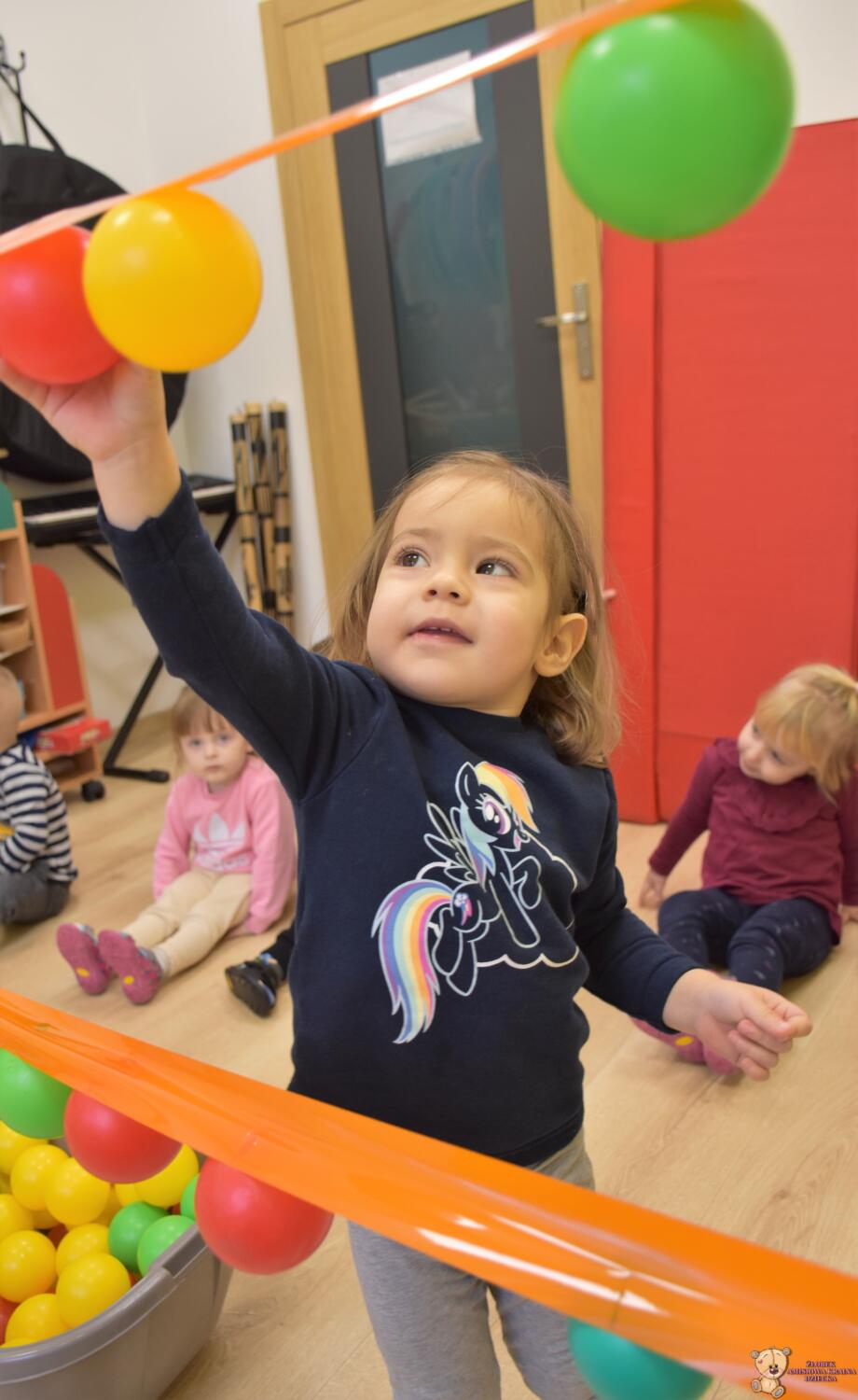 Dziś na zajęciach motoda Montessori Amisiaki przyklejały kolorowe piłki do taśmy. Dla starszaków była to okazja do potrenowania rozpoznawania kolorów – losowały kolor, nazywały go, a następnie szukały piłki w takim samym.