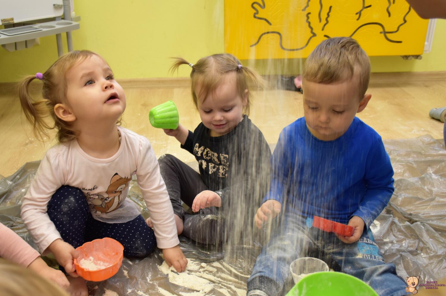 Śnieg za oknem już stopniał, więc w dniu dzisiejszym na zajęciach sensoplastyki Amisiaki stworzyły sztuczny śnieg za pomocą mąki i pianki do golenia. Wiele radości sprawiła im zabawa w miękkiej masie oraz lepienie bałwanków.