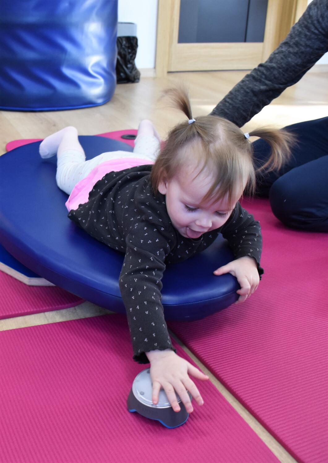 Dziś na rozgrzewkę trochę pobiegaliśmy, chodziliśmy jak niedźwiadki i skakaliśmy Później wujek pokazał nam kolorowe światełka, które musieliśmy nacisnąć aby zgasły. Najpierw szukaliśmy jednego świecącego światełka, a później konkretnego koloru Młodsze dzieci kręciły się również na desce rotacyjnej.