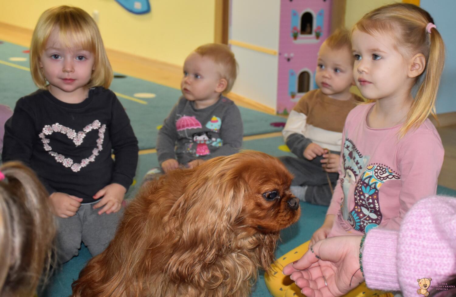 Dziś projekcja filmu „ Franklin i magiczne święta” Dzieci z uwaga oglądały i słuchały a potem odpowiadały na pytania . Razem z ciocia Marta przyszła dzisiaj Misia – nasz ulubiony psi terapeuta Na sam koniec dzieci bawiły się i puszczały banki – ćwicząc układ oddechowy.