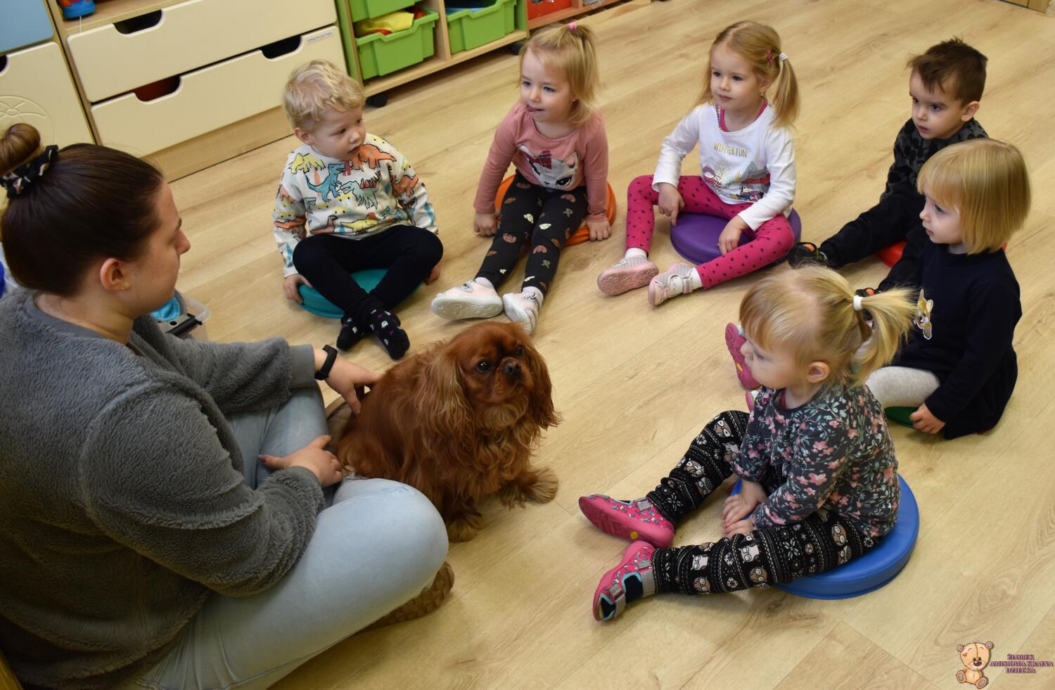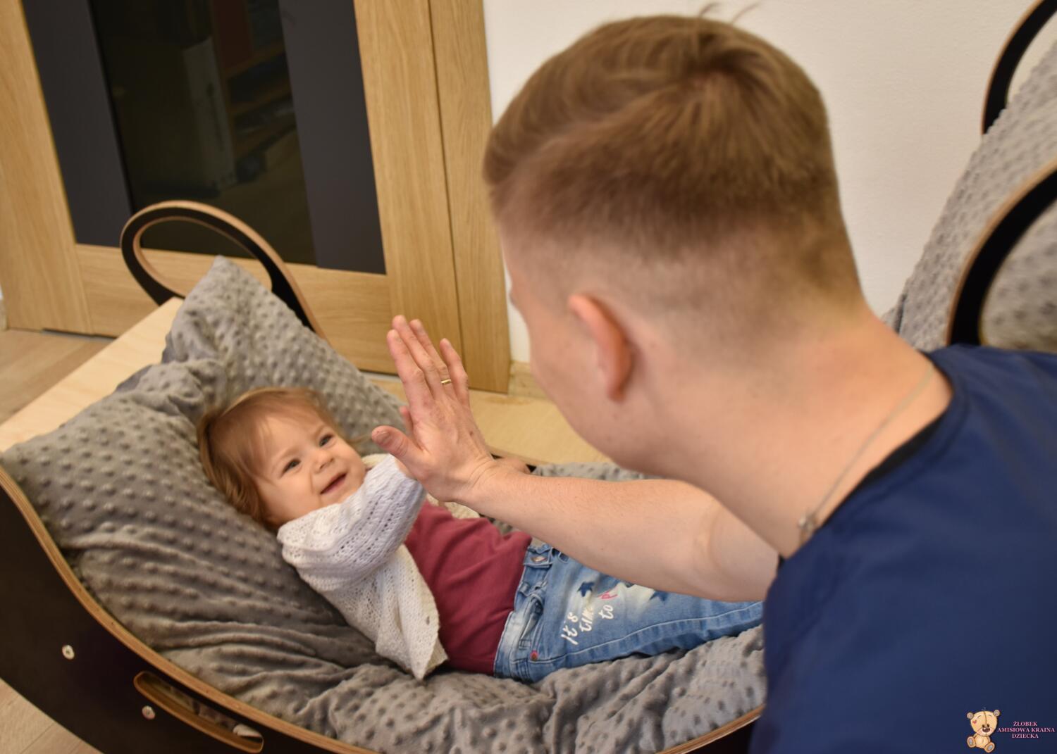 Dziś wsłuchiwaliśmy się w odgłosy zwierząt i wskazywaliśmy je na obrazkach. Starsze dzieci pięknie udawały odgłosy znanych zwierząt. Starszaki zainspirowane postacią żabki wskakiwały i wyskakiwały do „kałuży”. Każdy w nagrodę mógł przez chwilę pobujać się kołysce