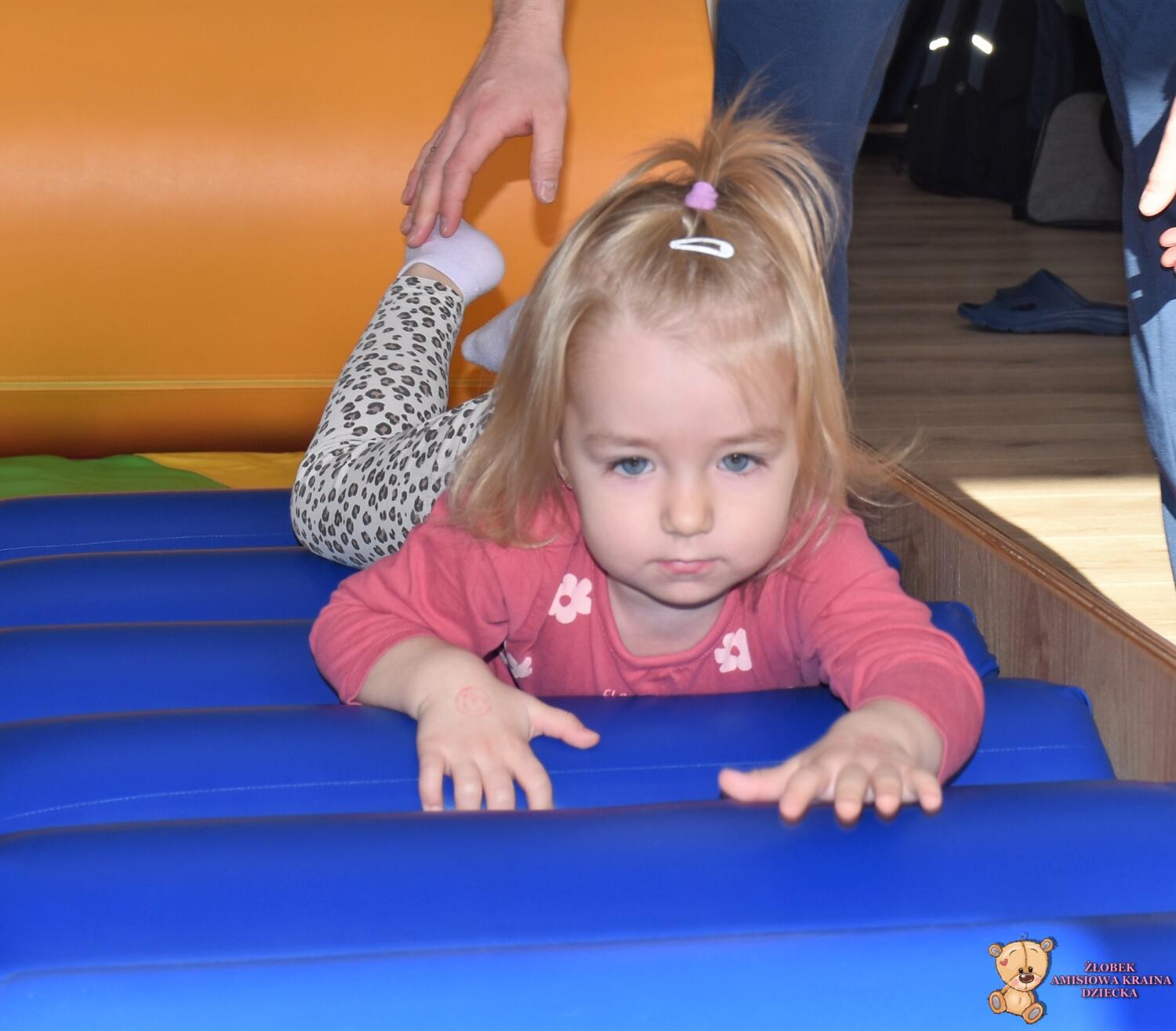 Dzisiaj nasze Skarby pokonywały tor przeszkód, wspinały się pod górę, przetaczały po wałku, a następnie pełzały po zjeżdżalni z wałków Wcześniej Maluchy uczyły się, a Starszaki przypominały sobie części ciała. Pokazywaliśmy na lalce, króliczku, a także na sobie Dzieci świetnie wszystko wskazywały