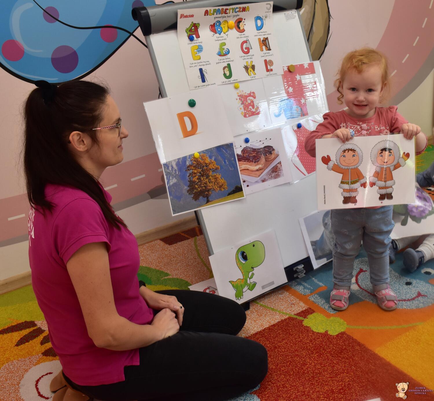 Na dzisiejszych zajęciach z literkowa grupa Niedźwiadków przypomniała sobie trzy litery: D, E, F. Dzieci bezbłędnie rozpoznawały rzeczy z ilustracji , a następnie dopasowywały odpowiednie litery do obrazków.
