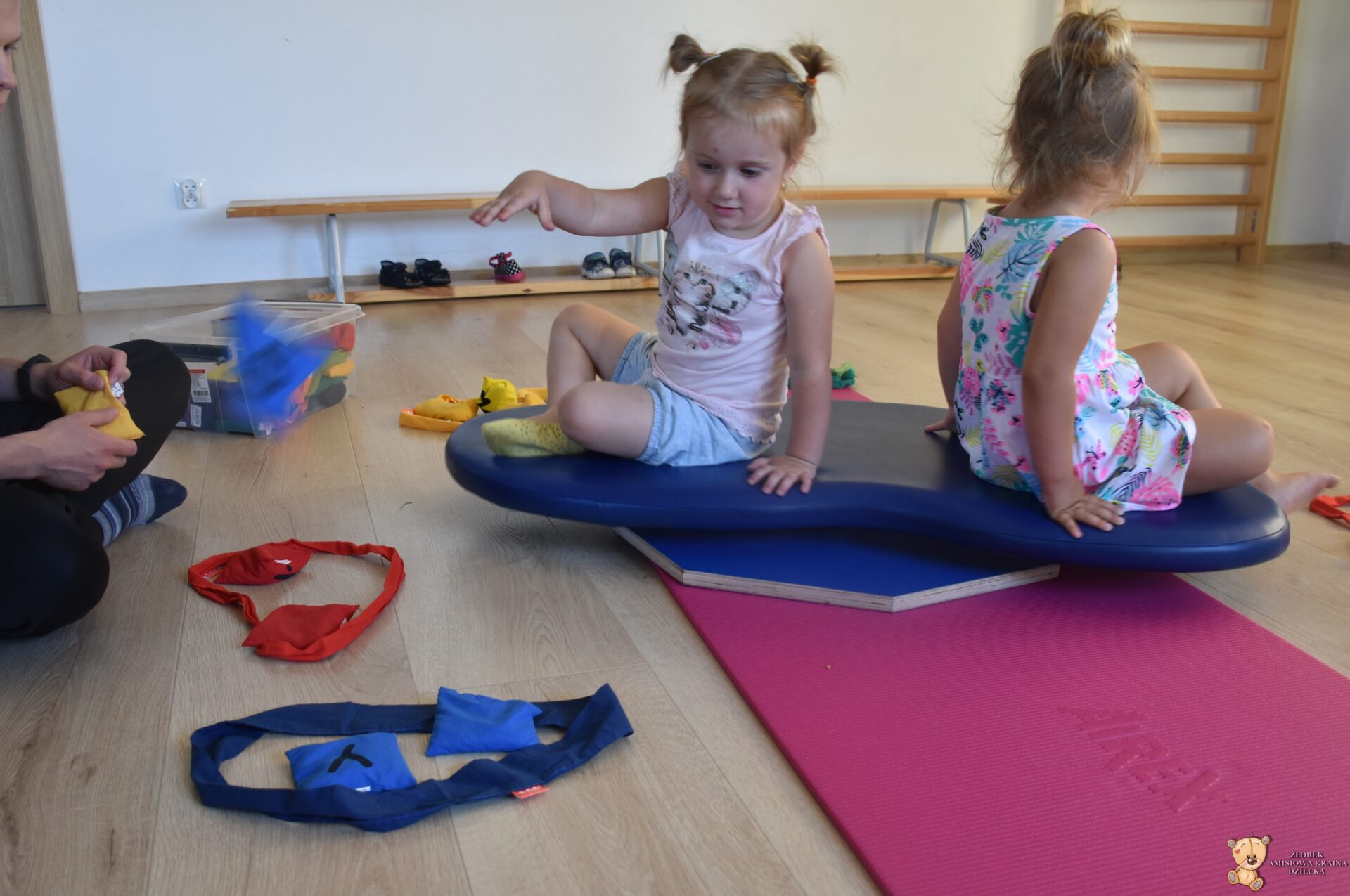 Wszyscy lubimy się kręcić na desce rotacyjnej. Razem z wujkiem ćwiczyliśmy rozpoznawanie kolorów i rzucaliśmy do celu. Dzieci dziś, po dłuższej przerwie miały okazję pobawić się zabawkami gniotkami. Grupa Maluchów huśtała się również na huśtawce. Starszaki zaś miały okazję poćwiczyć z woreczkami swoją równowagę i koordynację.