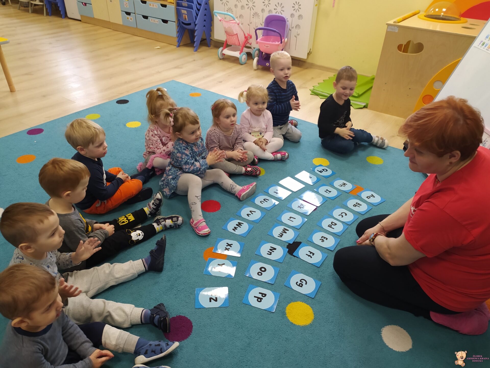 Podczas dzisiejszych zajęć grupa motylków poznała literke 'B’. Dzieci pisały literkę na tablicy oraz rysowały ją paluszkiem po tacy, na której byla wysypana mąka. Ich zadaniem byłorównież dopasowanie przedmiotów do odpowiednich obrazków zaczynających się na „B”.