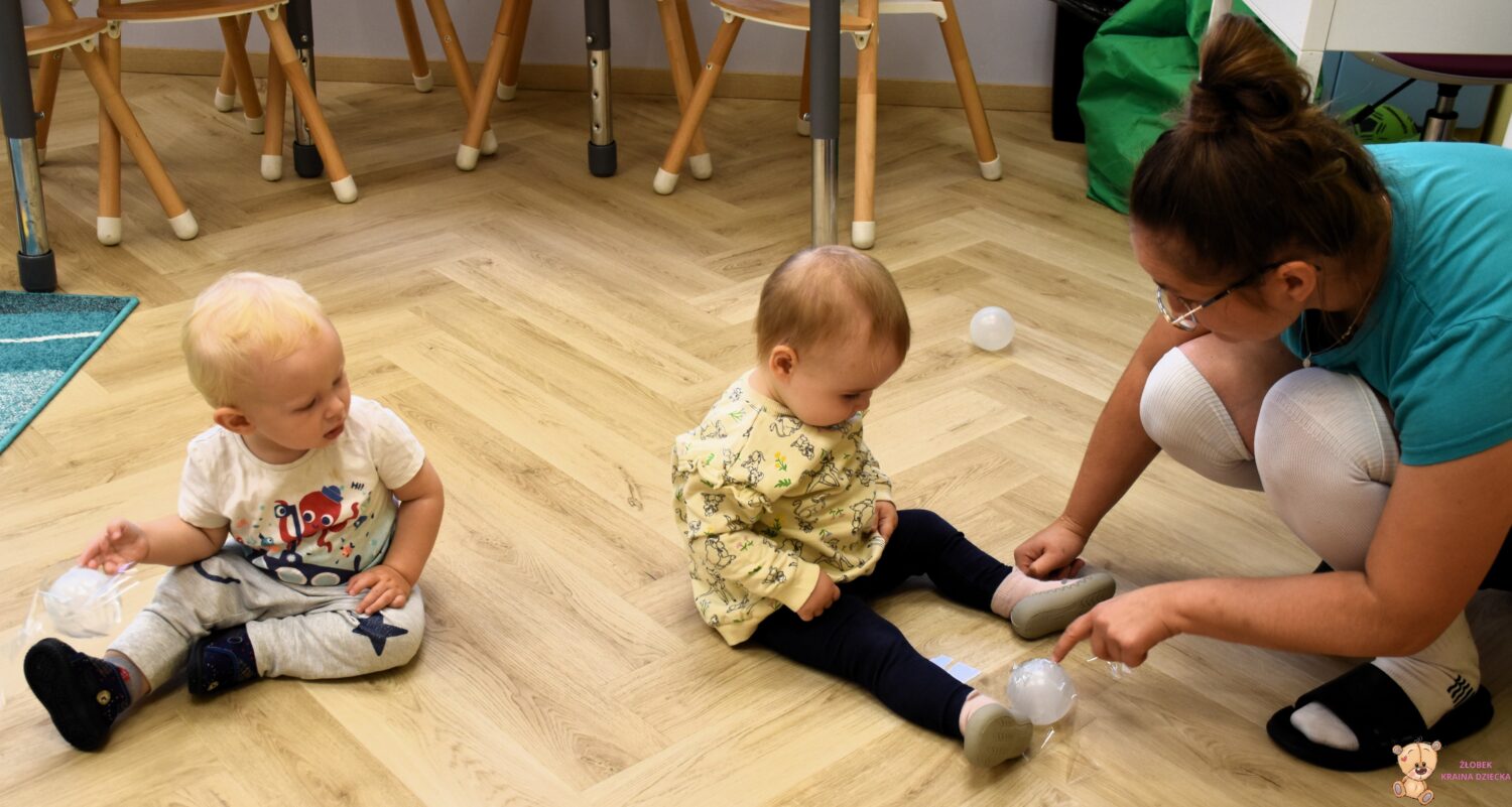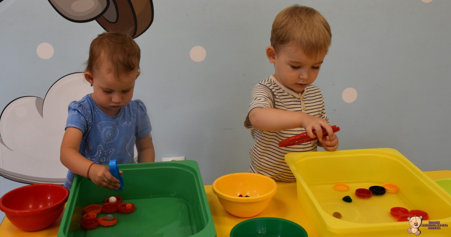 Dziś na zajęciach z metody Montessori Amisie ćwiczyły rączki, koncentrację i orientację przestrzenną Zadaniem dzieci było przenoszenie pomponów za pomocą pęsety. Ponieważ całe zadanie odbywało się w pojemnikach z wodą, zabawa była jeszcze bardziej atrakcyjna