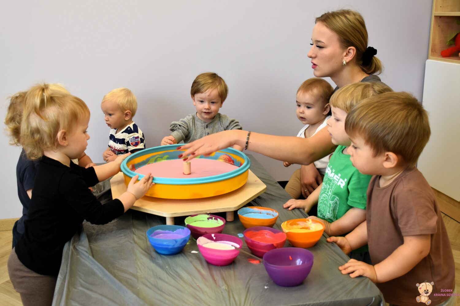 Na dzisiejszych zajęciach sensoplastyki odkrywaliśmy barwny świat, korzystając z „karuzeli kolorów” Farby zostały przygotowane w naturalny sposób – z jogurtu naturalnego i barwników spożywczych, dzięki czemu były całkowicie bezpiecznePodczas zajęć każdy mógł samodzielnie wybrać kolor i dowolnie łączyć z innymi barwami W ten sposób powstawały niezwykłe, pełne wyobraźni i ekspresji kolorowe pejzaże