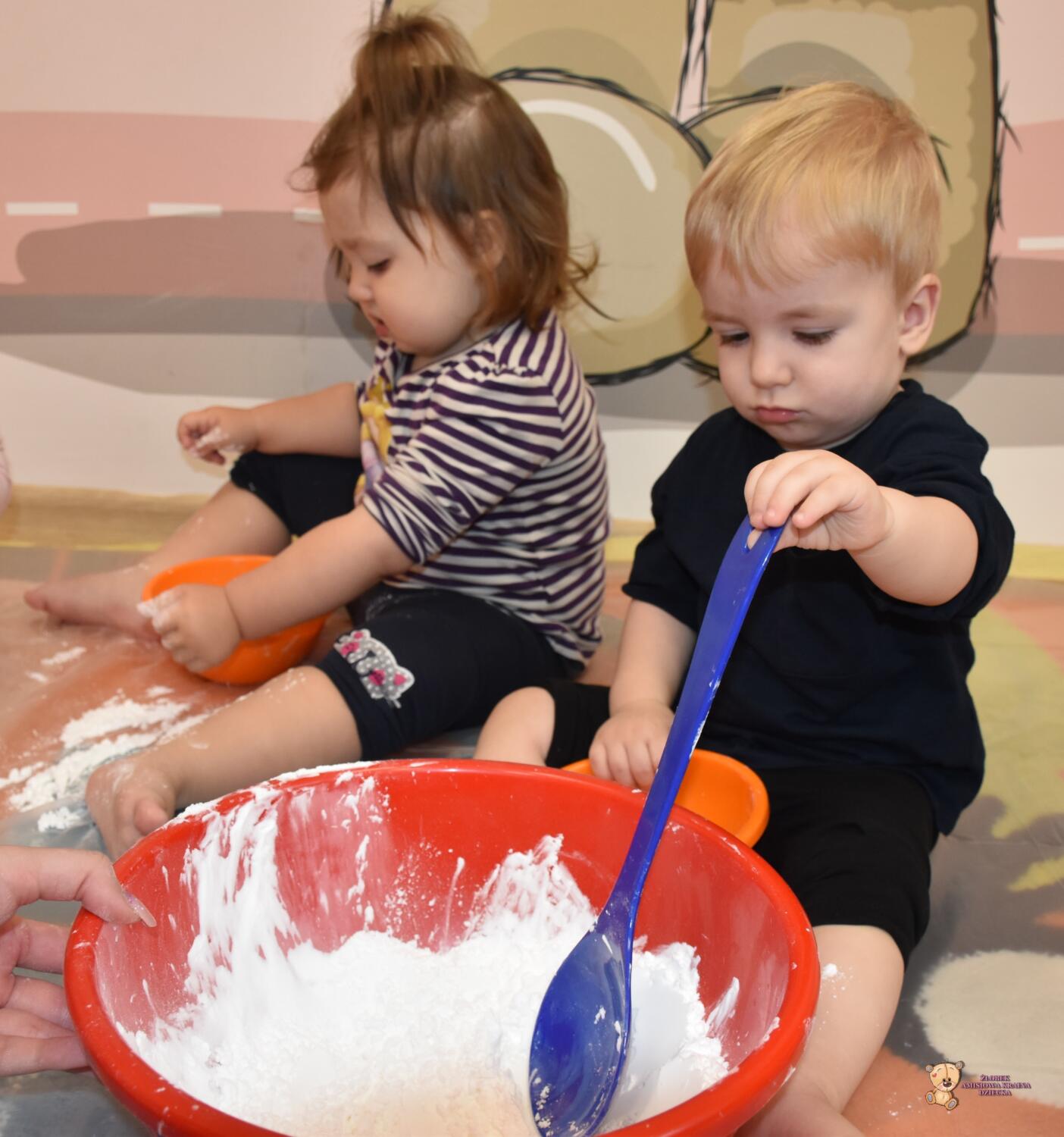 Dzisiaj na zajęciach sensoplastyki dzieci robiły masę zwaną cieczą nieniutonowską. Same z pomocą cioci wsypywały do miseczek składniki i je proporcjowały. Ugniatały w rękach i lepiły. Była to dla nich świetna zabawa.