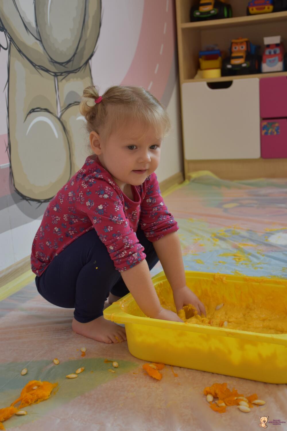 Dziś na zajeciach dyniolina czyli masa z ugotowanej dyni i skrobi ziemniaczanej. Masa wyszła mięciutka, aksamitna i pięknie pachnąca. Dzieci fantastycznie się w niej bawiły