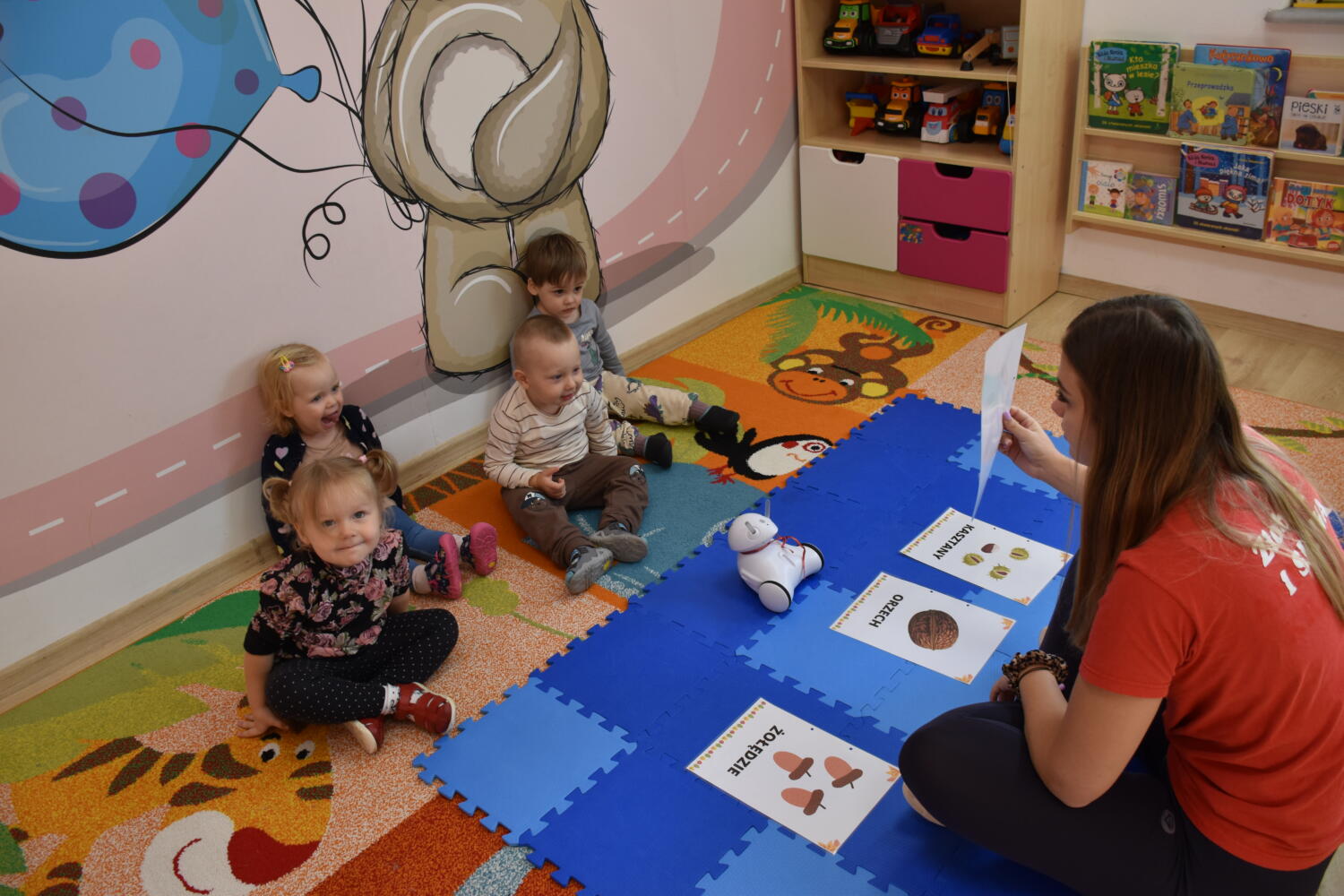 Dzisiaj w naszym żłobku odbyły się kolejne zajęcia z robotem Photon Ich tematem była jesień. Dzieci wspólnie z robotem i ciocią Klaudią poznały dary jesieni. Później dzieci dopasowywały jesienne dary do odpowiedniego obrazka.Na koniec wpólnie z robotem planowały trasę.
