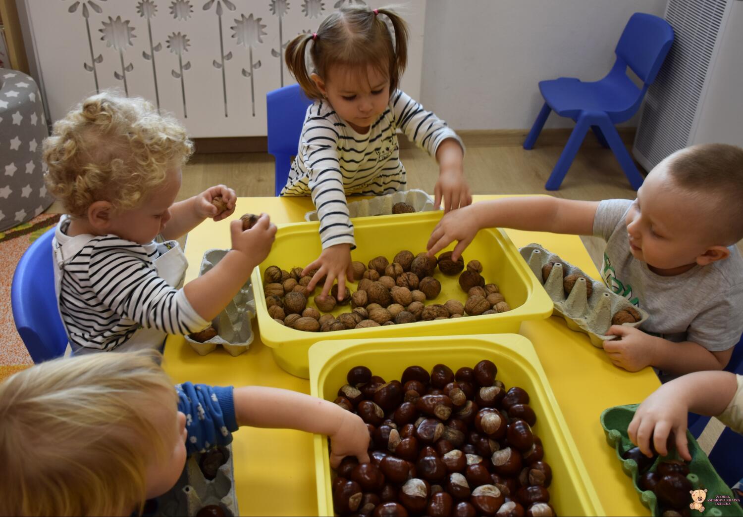 Dziś na zajęciach z metody Montessori Amisie poznały kolejne owoce. Są to owoce kasztanowca i orzecha Maluszki chętnie masowały swoje rączki w orzechach i kasztanach oraz sortowały je Celem zajęć było usprawnianie motoryki małej i koordynacji ręka oko