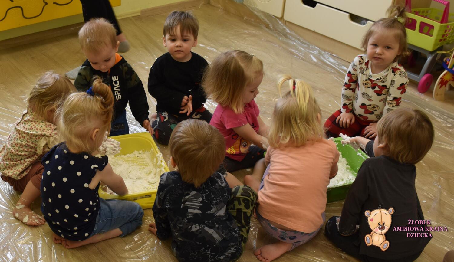 W dniu dzisiejszym Amisiaki, na zajęciach z sensoplastyki samodzielnie wykonały aksamitną, miłą w dotyku, kolorową ciastolinę. Wystarczy tylko odzywka i mąka ziemniaczana by wyczarować masę, która sprawia tak wiele radości każdemu dziecku ! To była wspaniała zabawa!