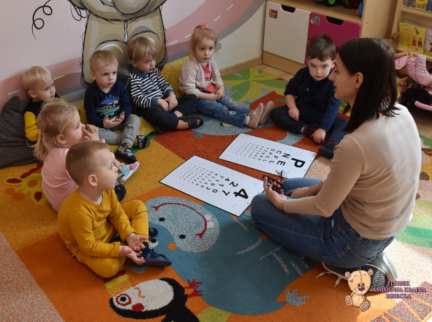 W dniu dzisiejszym ciocia pielęgniarka przeprowadziła pogadankę na temat higieny wzroku. Dzieci wiedzą jak wygląda wizyta u okulisty oraz dlaczego nosimy okulary. Na koniec zajęć dzieci wysłuchały z zaciekawieniem wiersza Juliana Tuwima ”Okulary”.