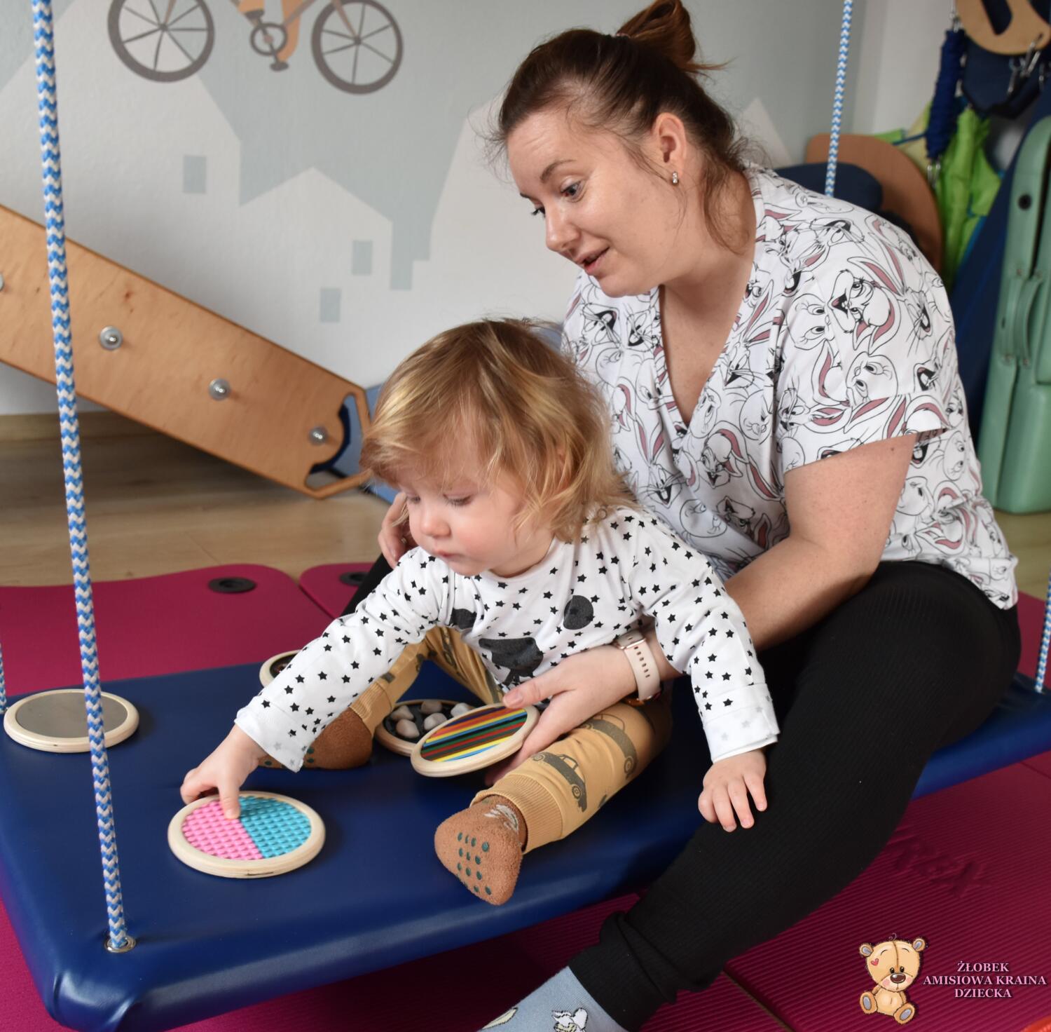 Dziś na zajęciach Integracji Sensorycznej Amisiaki stymulowały układ przedsionkowy, równowagę oraz dotyk. Ciocia łagodnie nas huśtała, a Dzieci dotykały dysków sensoryczych i szukały takich samych. Trzeba było wygodnie usiąść na platformie, utrzymać równowagę podczas ćwiczeń. Amisiaki były zaciekawione i bardzo zaangażowane. Super!