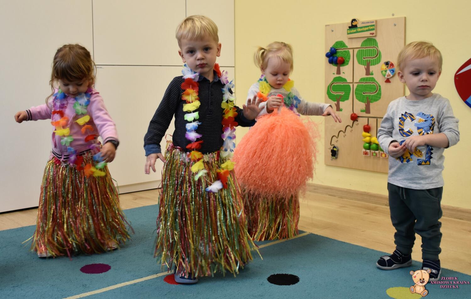 Dziś nasi żłobkowicze wzięli udział w hawajskim dniu zumby. Przebraliśmy się w kolorowe sukienki i naszyjniki, tańczyliśmy do dwóch wesołych utworów. Dzieci chętnie powtarzały ruchy, klaskały, machały, tupały nóżkami. Dziś rozwijaliśmy koordynację ruchową, poczucie rytmu i umiejętności taneczne.